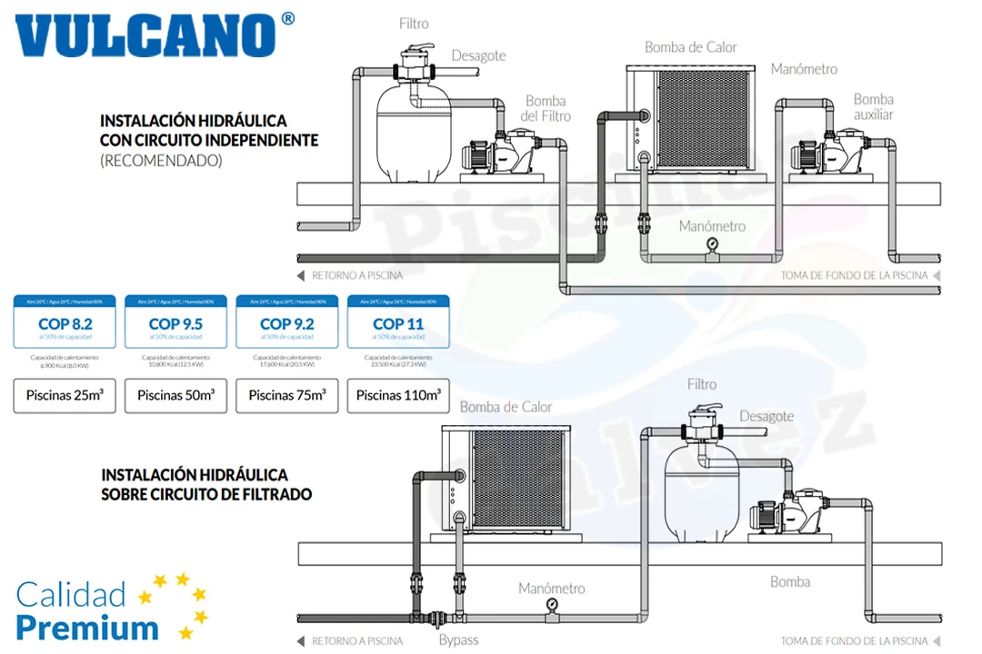 Bomba de calor para climatizar piscinas POOL-INVERTER 25 con intercambiador de titanio, equipo eléctrico de 230V – 27.300 BTU (8.0kW). Las bombas de calor Vulcano con Tecnología INVERTER son equipos silenciosos que gracias a su COP promedio de 8.2 reducen a la mitad el costo de funcionamiento del equipo.