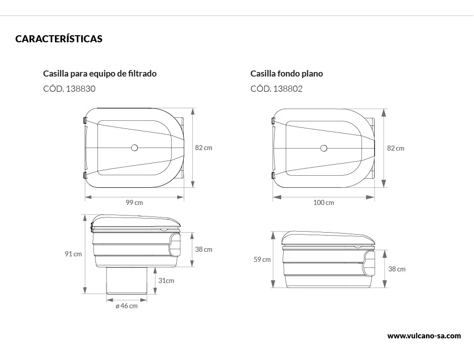 Casilla soplada fondo plano Vulcano. Fabricada de polietileno soplado de alta densidad, están diseñadas para equipos de filtrado ofreciendo alto grado de resistencia mecánica y protección UV. Gabinete para ser enterrado que puede ser utilizado como sala de bombeo o para alojar al equipo de filtración realizando un perforación en su fondo. Es una excelente opción para la disminución de tiempo y procesos, simplificando y haciendo más económico el proyecto.