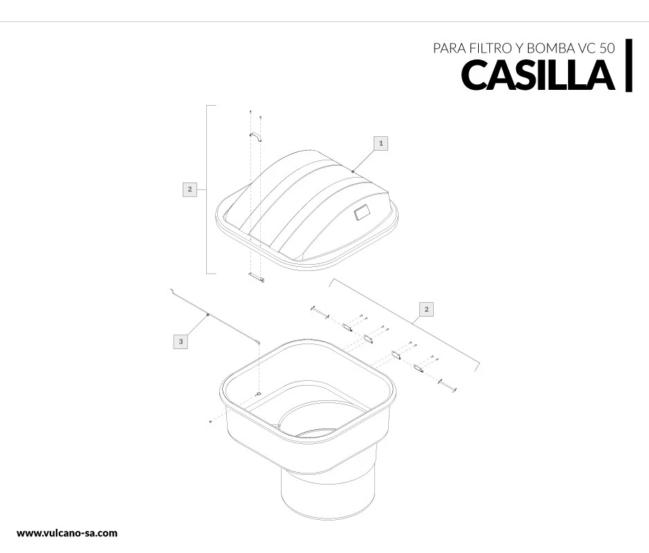 Casilla de polietileno rotomoldeado con orificio inferior para evitar inundaciones. Ideada para ser enterrada y dejar visible sólo tapa, en su interior encontramos los alojamientos para la fijación del filtro VC-50 y la electrobomba. Este centro compacto de instalación se convierte en una excelente opción para la disminución de tiempos y procesos, simplificando y haciendo más económico el proyecto.