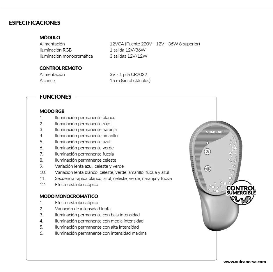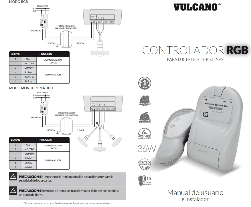 Controlador RGB 36W 12VCA para luminarias subacuáticas RGB. Permite controlar diferentes tipos de luces led RGB o monocromáticas mediante un control remoto. El equipo ofrece 12 funciones de iluminación en modo RGB y 6 funciones en modo monocromático. Incluye además una función de apagado automático luego de 6 hs de uso. Su control remoto es resistente a caídas dentro del agua y en caso de sustitución es de fácil configuración, también se pueden vincular controles remotos extra a un mismo controlador.