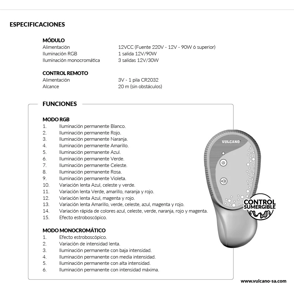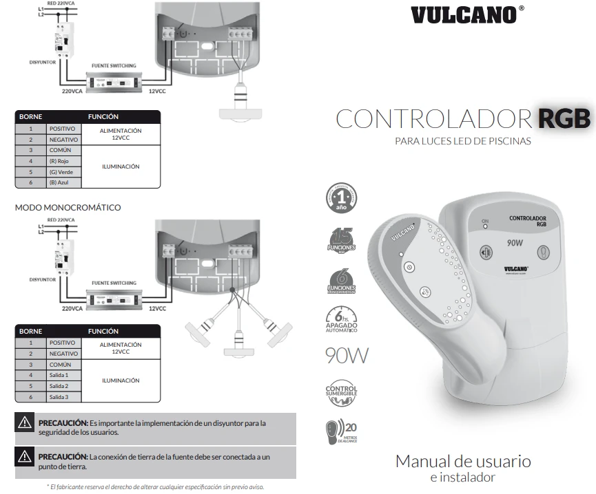 Controlador RGB 90W 12VCC para luminarias subacuáticas RGB. Permite controlar diferentes tipos de luces led RGB o monocromáticas mediante un control remoto. El equipo ofrece 15 funciones de iluminación en modo RGB y 6 funciones en modo monocromático. Incluye además una función de apagado automático luego de 6 hs de uso. Su control remoto es resistente a caídas dentro del agua y en caso de sustitución es de fácil configuración, también se pueden vincular controles remotos extra a un mismo controlador.