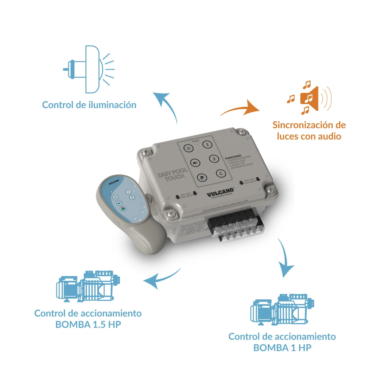 El Easy Pool Touch controla todas las funciones de la piscina desde el módulo de comando o mediante su control remoto resistente al agua. El equipo permite el control de las luces de la piscina, sincronizar las luces con señal de audio y controlar el encendido y apagado de la bomba del equipo de filtrado más una bomba auxiliar.