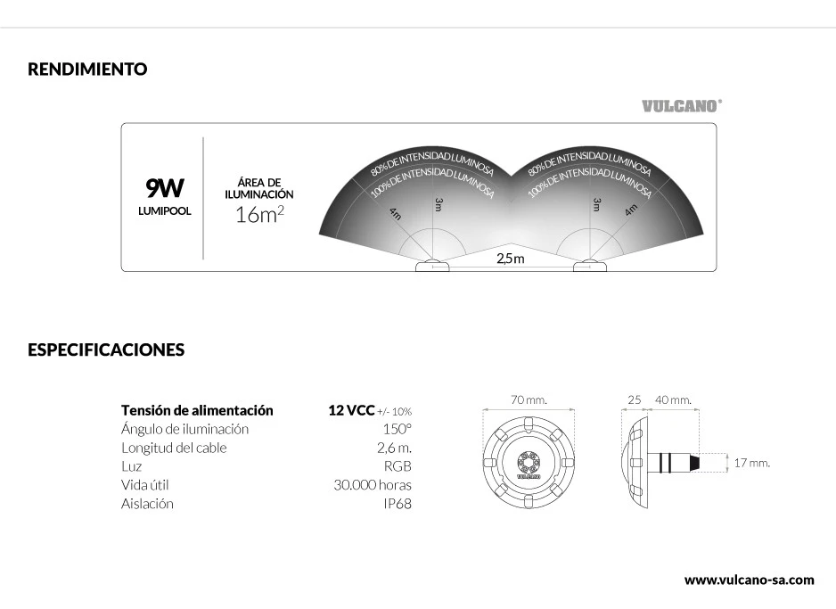 Luminaria subacuática LUMIPOOL 9W RGB 12 VCC. Con un ángulo de apertura de 150° y un área de iluminación de 16 m², brinda una excelente potencia de iluminación para su piscina, con niveles muy bajos de consumo de energía. Estas luces led RGB para pileta se instalan con controladoras RGB para brindar una amplia variedad de colores y diversas combinaciones de efectos (compatibles con controladores genéricos). Los artefactos son compactos y muy fáciles de instalar gracias a su sistema de encastre a presión en pasamuro. Fabricadas completamente en policarbonato, ofrecen un grado de protección IP68.