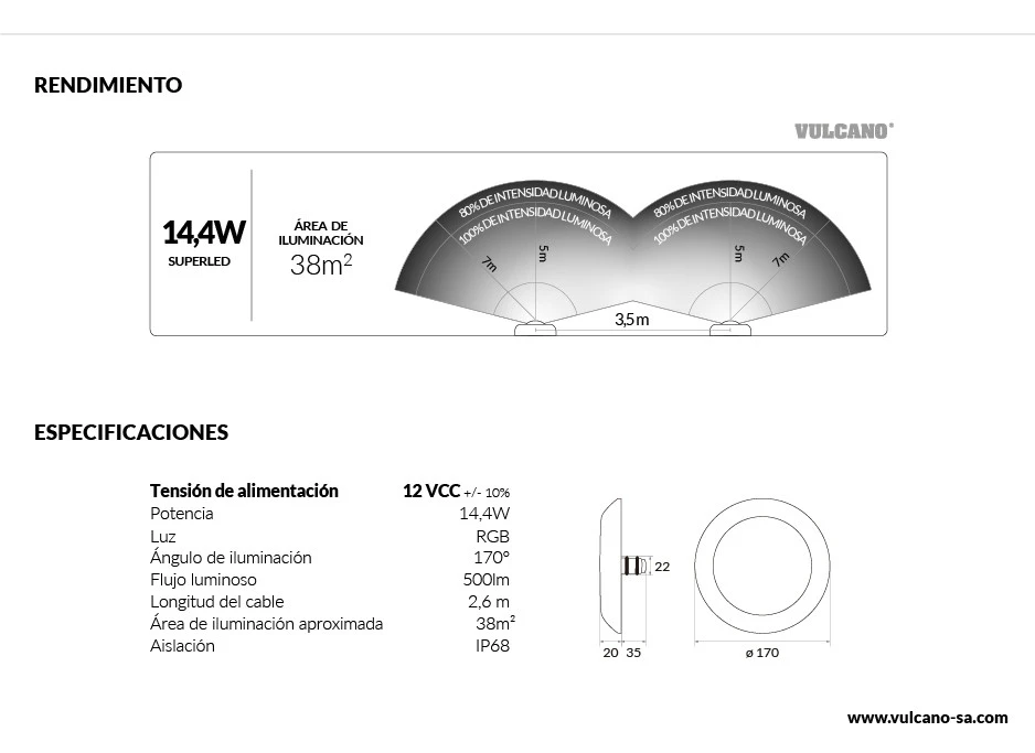 Luminaria subacuática SuperLED 14,4W RGB 12 VCC. Con ángulo de apertura de 170° y área de iluminación de 38 m².