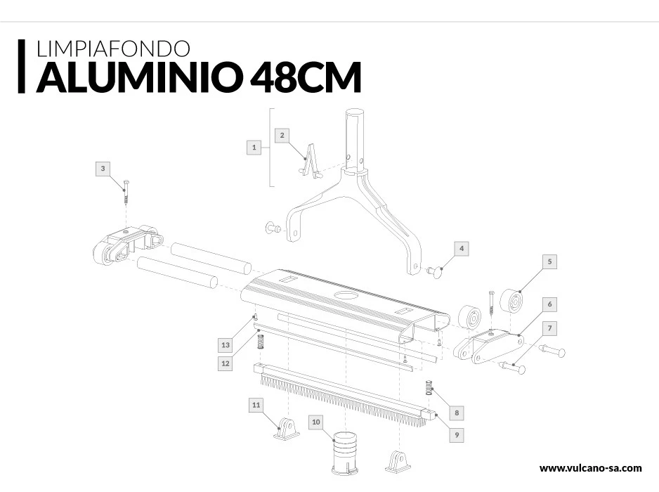 Limpiafondo de aluminio con 4 ruedas fijas, y con un ancho de 48cm. Ha sido pensado para uso profesional. Para su correcto funcionamiento, usar con bomba de 0,75 HP o superior.