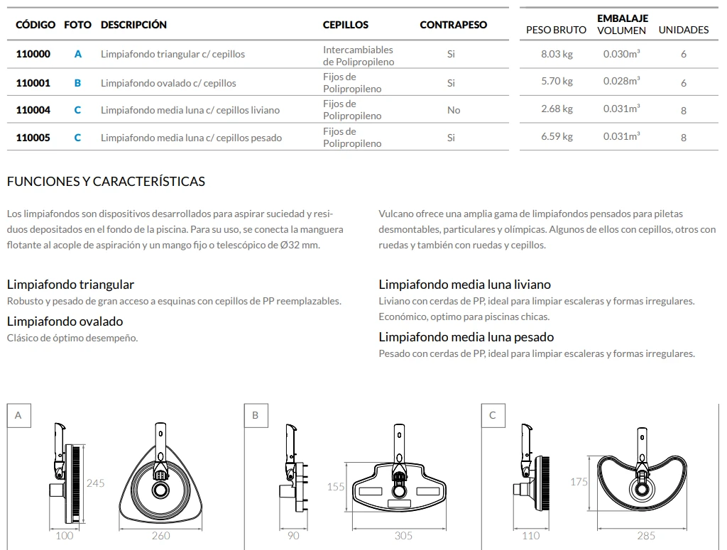 Los limpia fondos Vulcano, son dispositivos desarrollados para aspirar la suciedad y los residuos depositados en el fondo de la piscina. Ofrecemos 5 modelos de limpia fondo con cepillo que se adaptan a toda necesidad.