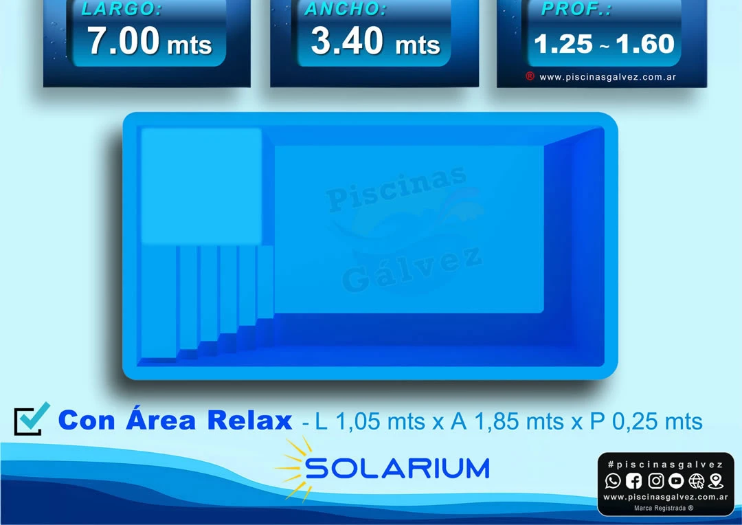 - Solarium: Área Relax - Largo 1.05 mts x Ancho 1.85 mts x Profundidad 0.25 mts
