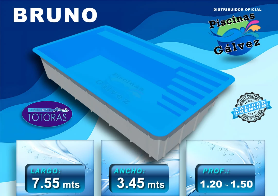 Garantía: Al igual que todas las piscinas de Piscinas Totoras, el modelo BRUNO está respaldado por una garantía de calidad de 15 años en su casco, proporcionando tranquilidad y confianza en su durabilidad y fiabilidad. Todas nuestras piscinas se distinguen por su calidad premium y durabilidad.