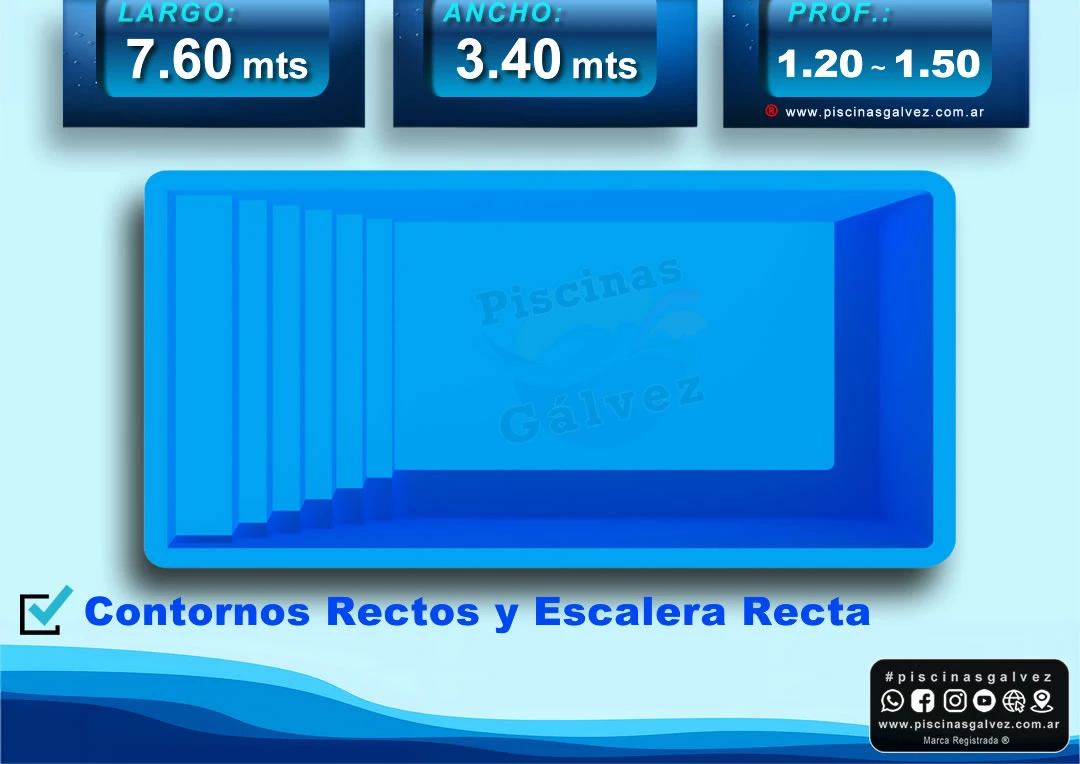 Descripción: Sumérgete en el lujo y la comodidad con el modelo Felipe de Piscinas Totoras. Con una longitud de 7,60 metros y un ancho de 3,40 metros, esta piscina ofrece un espacio generoso para disfrutar de momentos inolvidables en el agua.