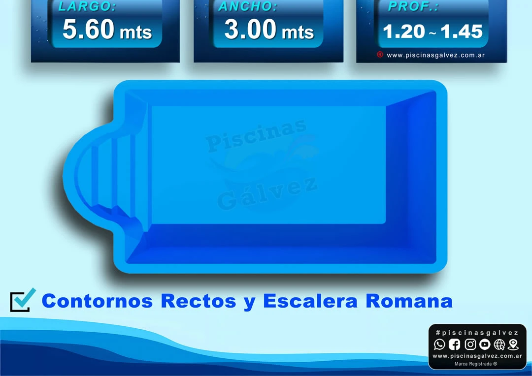 Escalera Tipo Romana: El modelo cuenta con una elegante escalera tipo romana, no solo funcional, sino que también complementa el diseño general de la piscina.