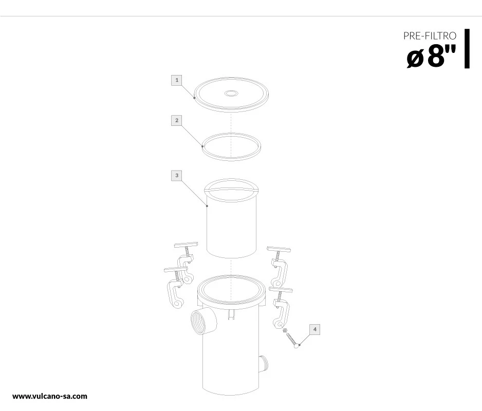 El pre-filtro Vulcano ø 8" está construido con un resistente cuerpo de hierro y cuenta con un canasto interior de 8" de diámetro. Su tapa de aluminio asegura un sellado adecuado. Su función principal es retener las impurezas presentes en el circuito, salvaguardando de este modo el funcionamiento óptimo de la bomba.