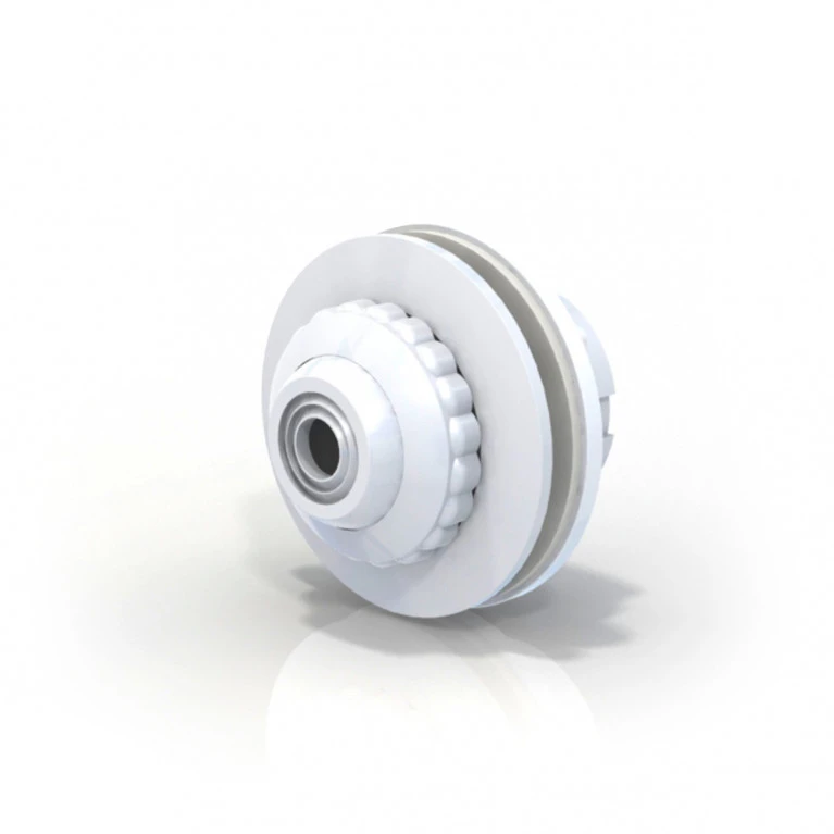 Retorno orientable para piscinas de fibra de vidrio, con aro desmontable blanco, cuerpo de ø 50mm para pegar, y boquilla esférica con pico de ø 19mm.