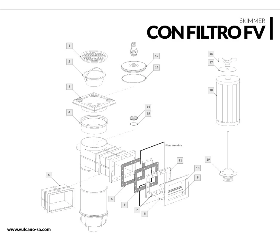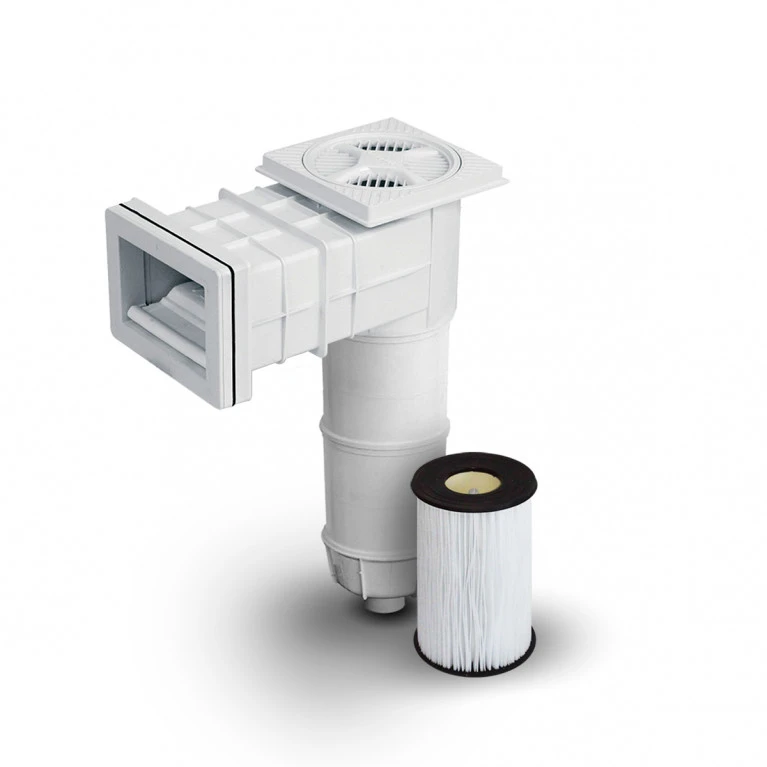 El Skimmer con filtro FV es una toma superficial de agua diseñada específicamente para piscinas de fibra de vidrio. Este modelo incluye un filtro incorporado de gran capacidad para eliminar impurezas de la superficie del agua. Dispone de conexiones con uniones dobles, incluyendo bujes de rosca hembra de 1 1/2" para caños de polipropileno y lisos de ø 50 mm para pegar caños de PVC. Es una excelente opción, ya que al conectarse directamente a la bomba, su instalación resulta muy económica.